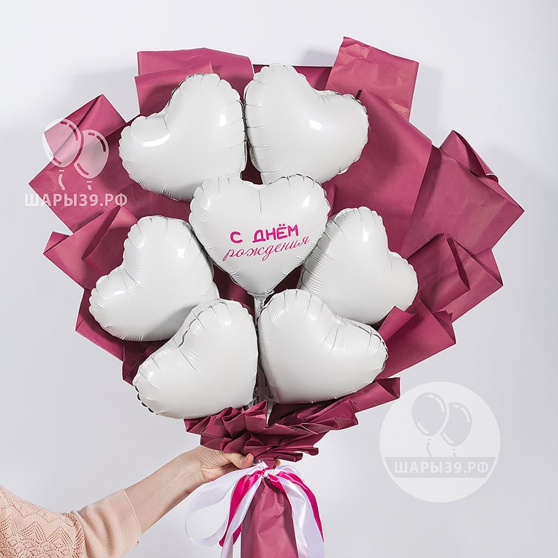 Крафт букет «Белый бархат» — стильная композиция из белых фольгированных сердец в яркой подарочной упаковке. Центральное сердце с надписью делает букет особенно тёплым и личным, а контраст белого и насыщенно-розового оттенков добавляет подарку выразительности.