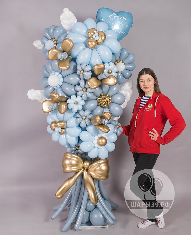 Премиум-композиция из шаров-цветов «Небесная симфония» — масштабный вау-букет в голубых и золотых оттенках. Объёмные цветы из воздушных шаров, акценты хрома и авторская сборка создают эффект роскошного подарка. Подходит для мамы, любимой или особенного события. Можно заказать с доставкой по Калининграду. Шары39 — профессиональная сборка и качественные материалы от чемпионов аэродизайна.