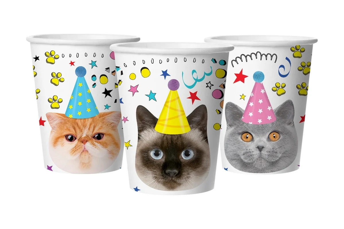 Красочная одноразовая посуда для любителей котиков станет дополнительным украшением торжества, а также поможет минимизировать время организации знаменательного события.