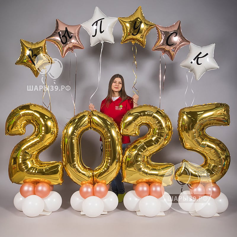 Набор шаров на выпускной «Золотой выпуск» — эффектная композиция для оформления праздника, фотозоны или сцены. Золотые цифры на воздушной подушке и арка из гелиевых фольгированных звезд с надписью «Выпуск» создают торжественное настроение и хорошо смотрятся на фотографиях. Подходит для детского сада, школы, выпускного класса и праздничного зала.