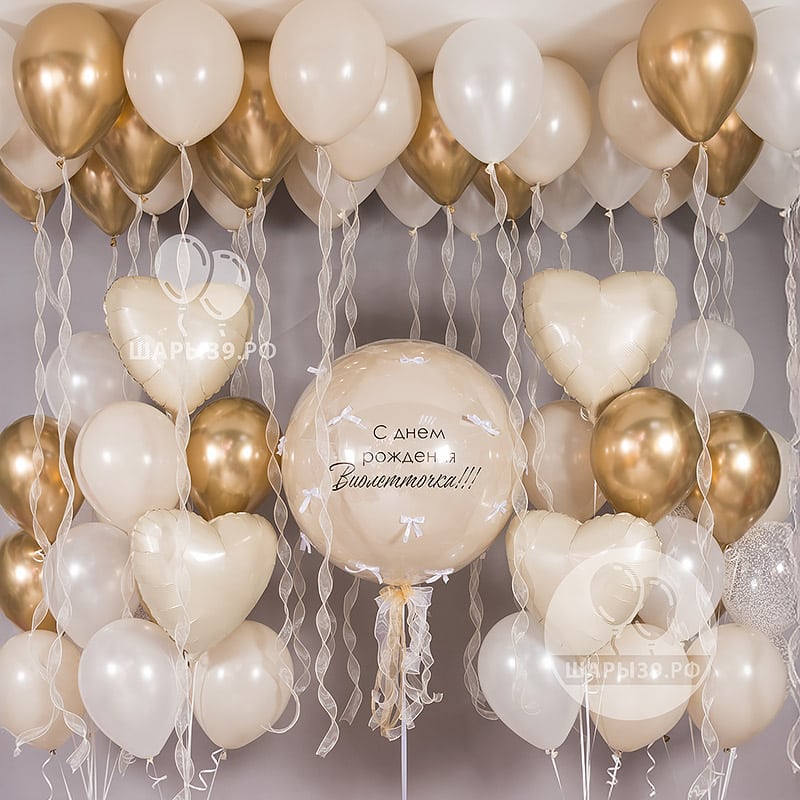 Набор «Золотая коллекция: Золотой праздник» — эффектное оформление праздника в кремово-золотой гамме. Гелиевые шары под потолком с широкой ленты из органзы создают воздушный праздничный фон, а большой «стеклянный» шар с индивидуальной надписью становится центром композиции. Идеально подходит для празднования для рождения или юбилея, фотосессии, свадьбы и сюрприза имениннику. Можно заказать с доставкой по Калининграду от Шары39.
