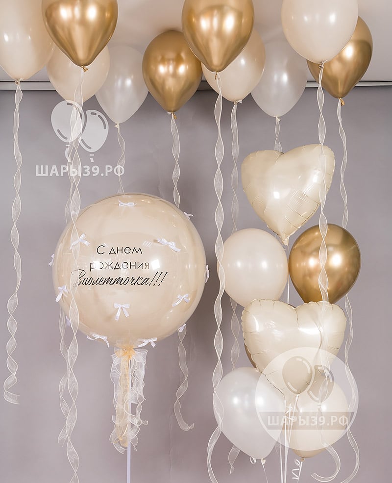 Набор «Золотая коллекция: Праздничный день» — эффектное оформление праздника в кремово-золотой гамме. Гелиевые шары под потолок с широкой лентой из органзы создают воздушный праздничный фон, а большой «стеклянный» шар с индивидуальной надписью становится центром композиции. Идеально подходит для празднования дня рождения или юбилея, свадьбы, выписки из роддома, фотосессии или сюрприза имениннику. Можно заказать с доставкой по Калининграду от Шары39.