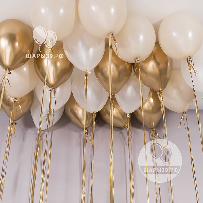 Элегантная композиция из гелиевых шаров в оттенках белого, кремового и благородного золота создаёт атмосферу торжества и лёгкой роскоши. Белые и кремовые шары придают композиции воздушность и свет, а золотые — мягкое сияние и праздничный акцент.