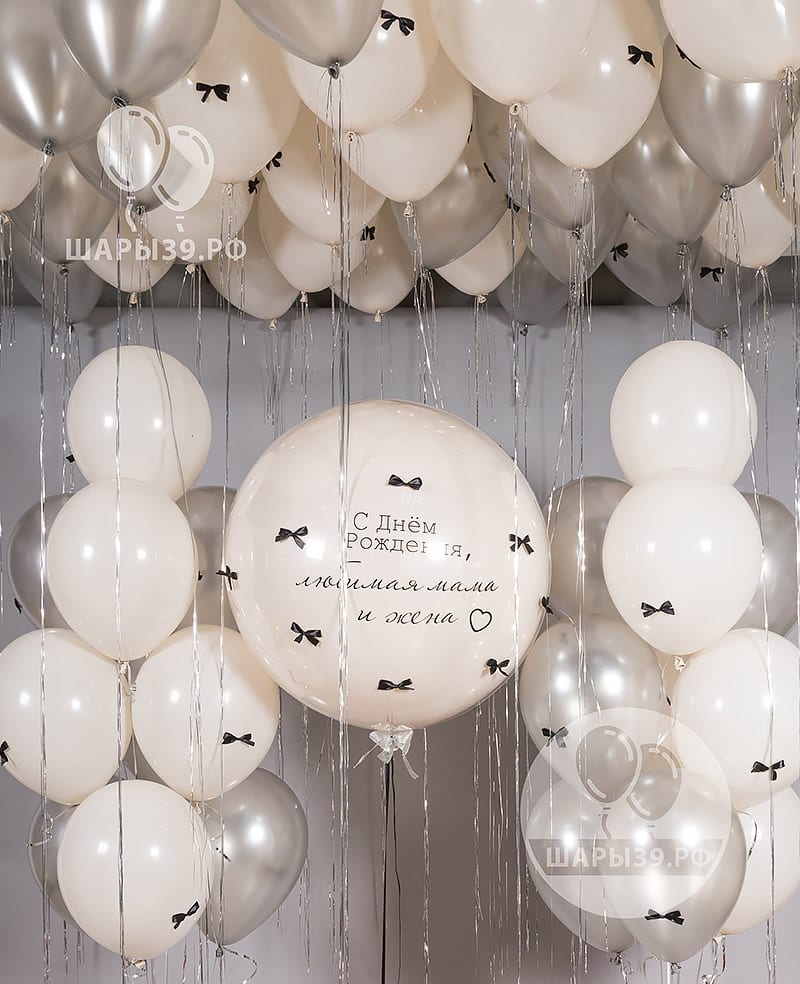 Хром: 2 фонтана (Хром -5, Пастель -5, Бант -10), Большой «стеклянный» шар с принтом и бантами (16 бантов), 30 шаров с дождиком под потолок (Хром -15, Пастель -15, Бант -30)