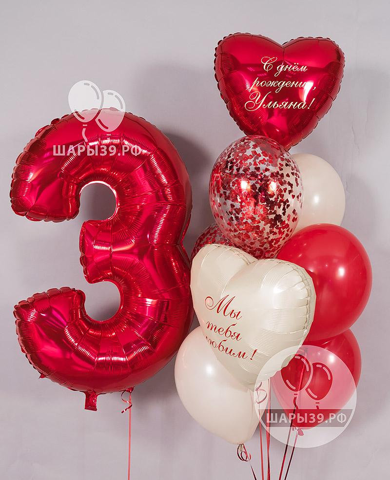 Набор шаров «Яркий момент» — яркая композиция с фольгированной цифрой, сердцами и шарами в красно-бежевой гамме.